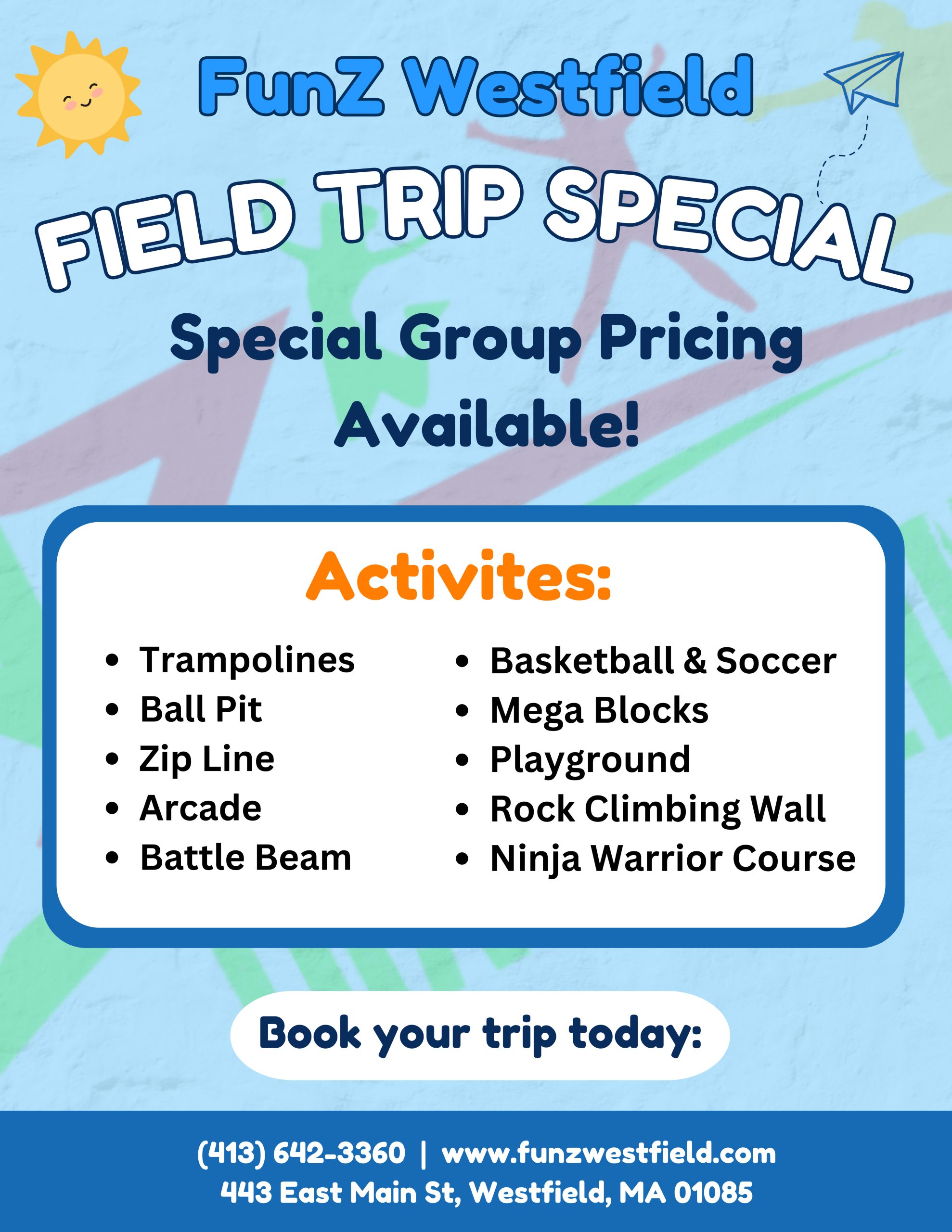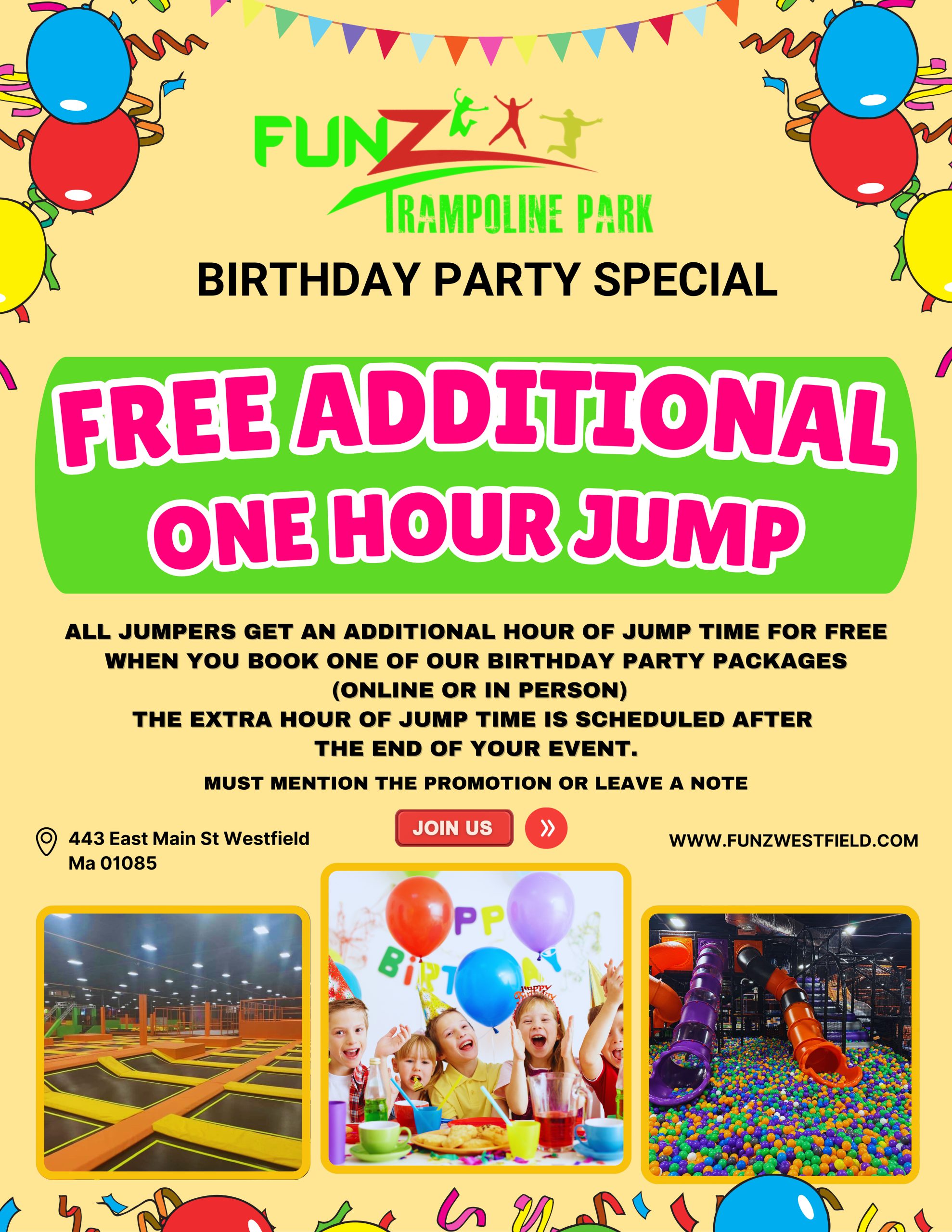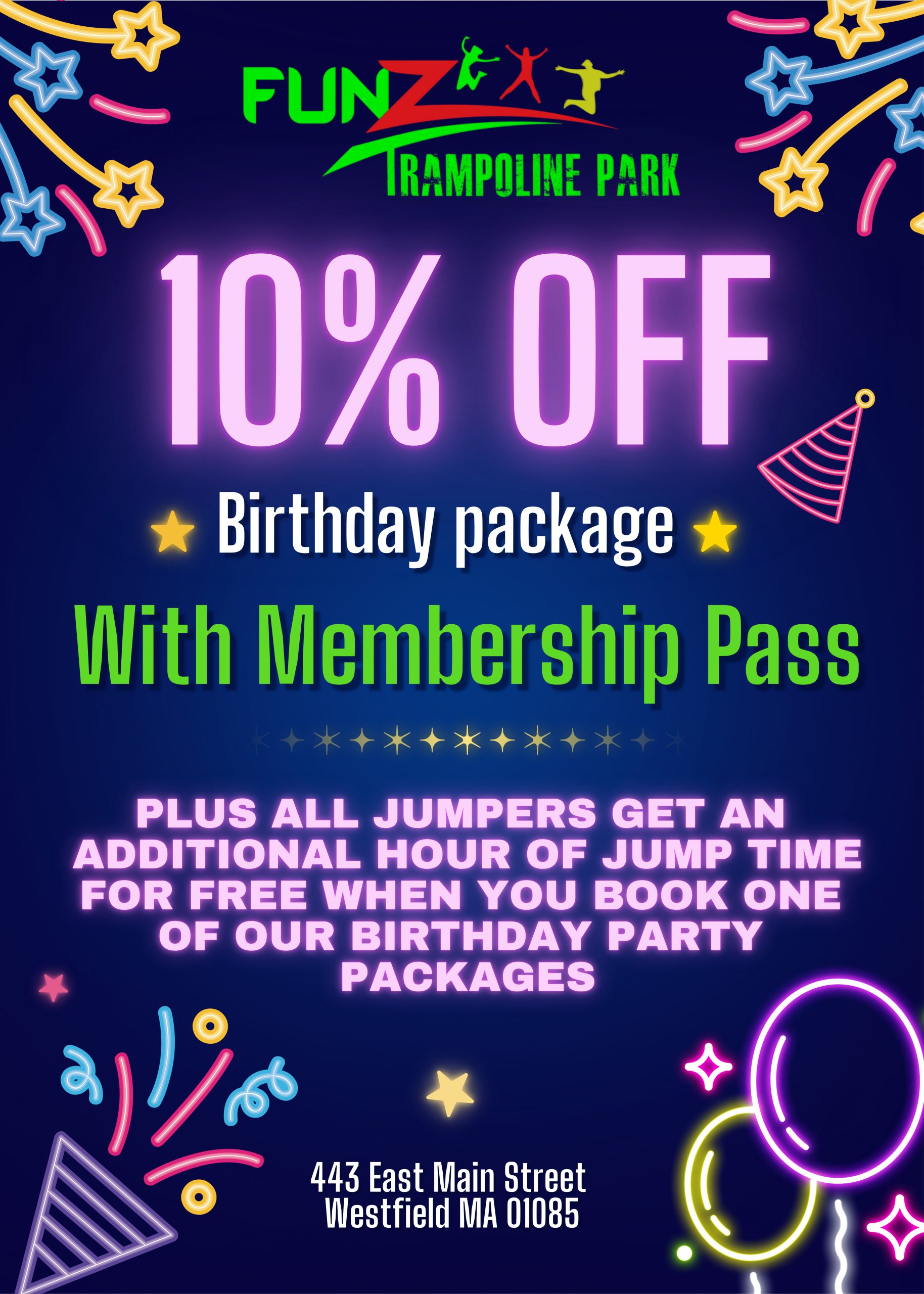 Buy TicketsGet ready to have a great time jumping at FunZ Trampoline Park in Westfield, MA. Our 51,000 square ft. facility is located at 443 E. Main Street in Westfield, MA.