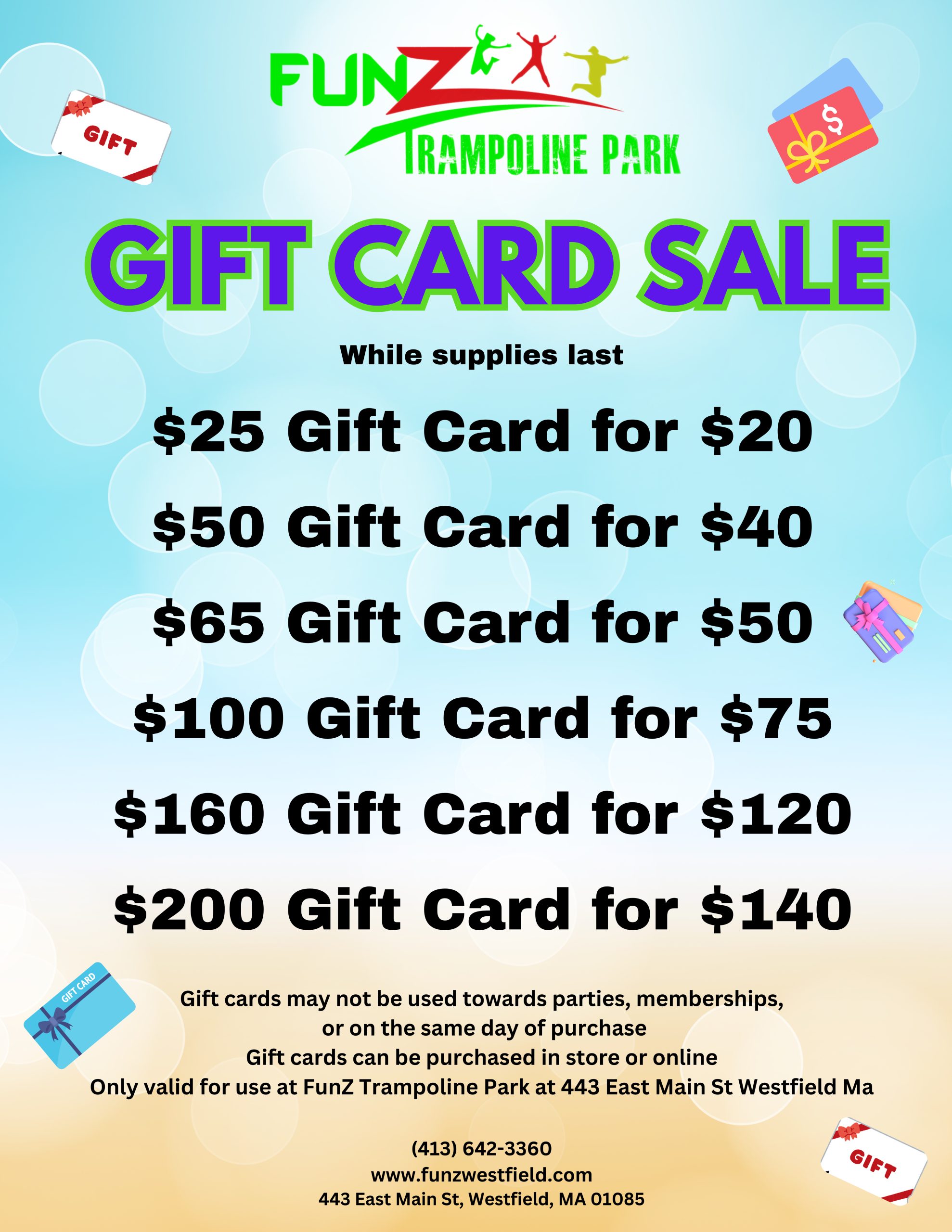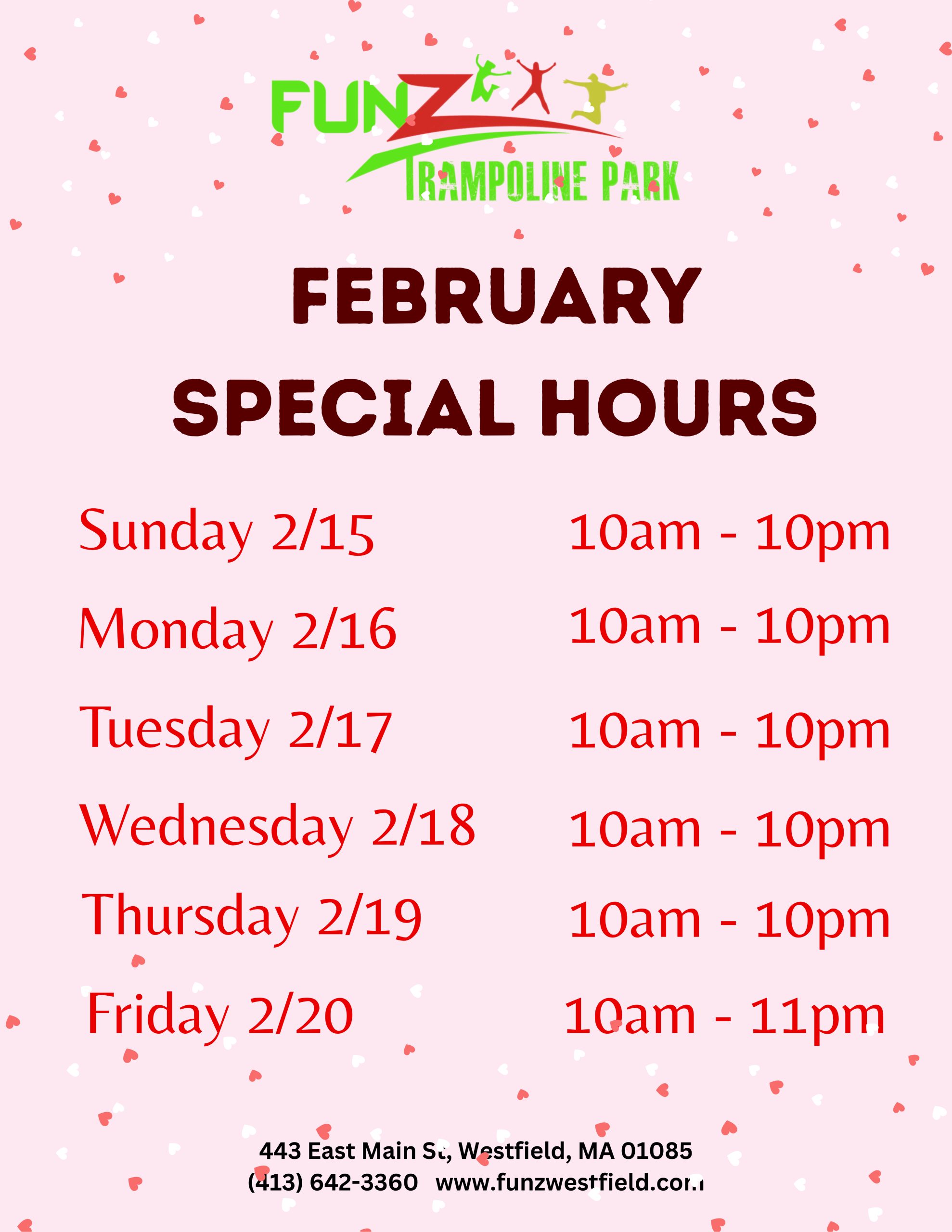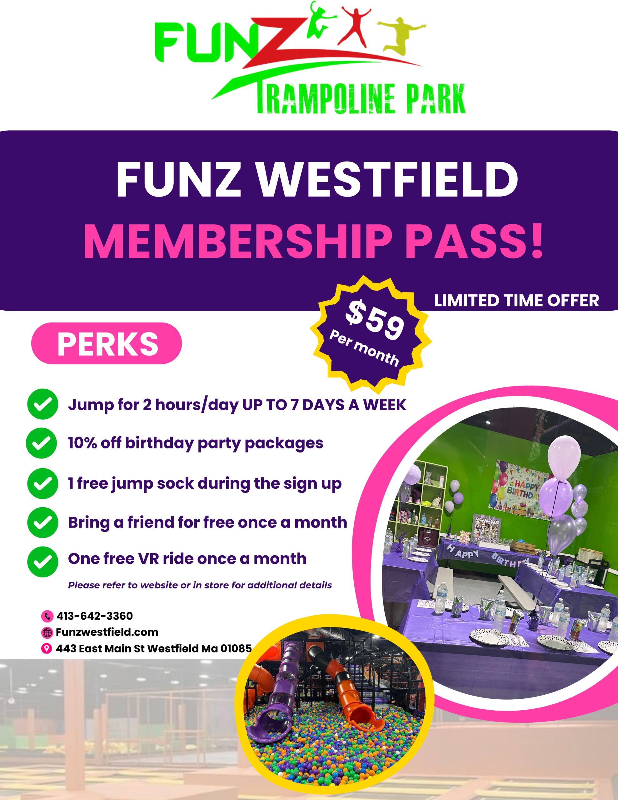 Buy TicketsGet ready to have a great time jumping at FunZ Trampoline Park in Westfield, MA. Our 51,000 square ft. facility is located at 443 E. Main Street in Westfield, MA.